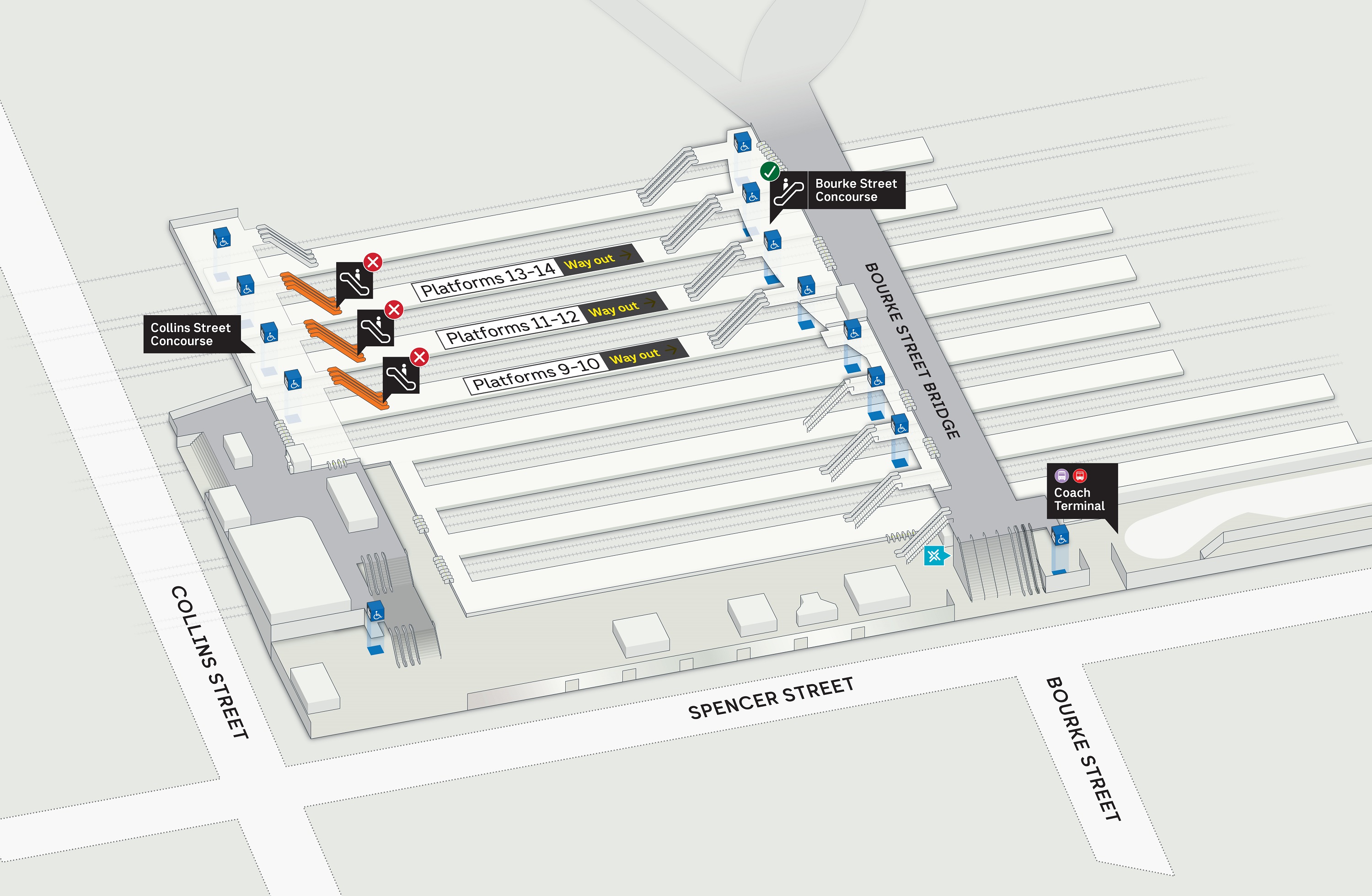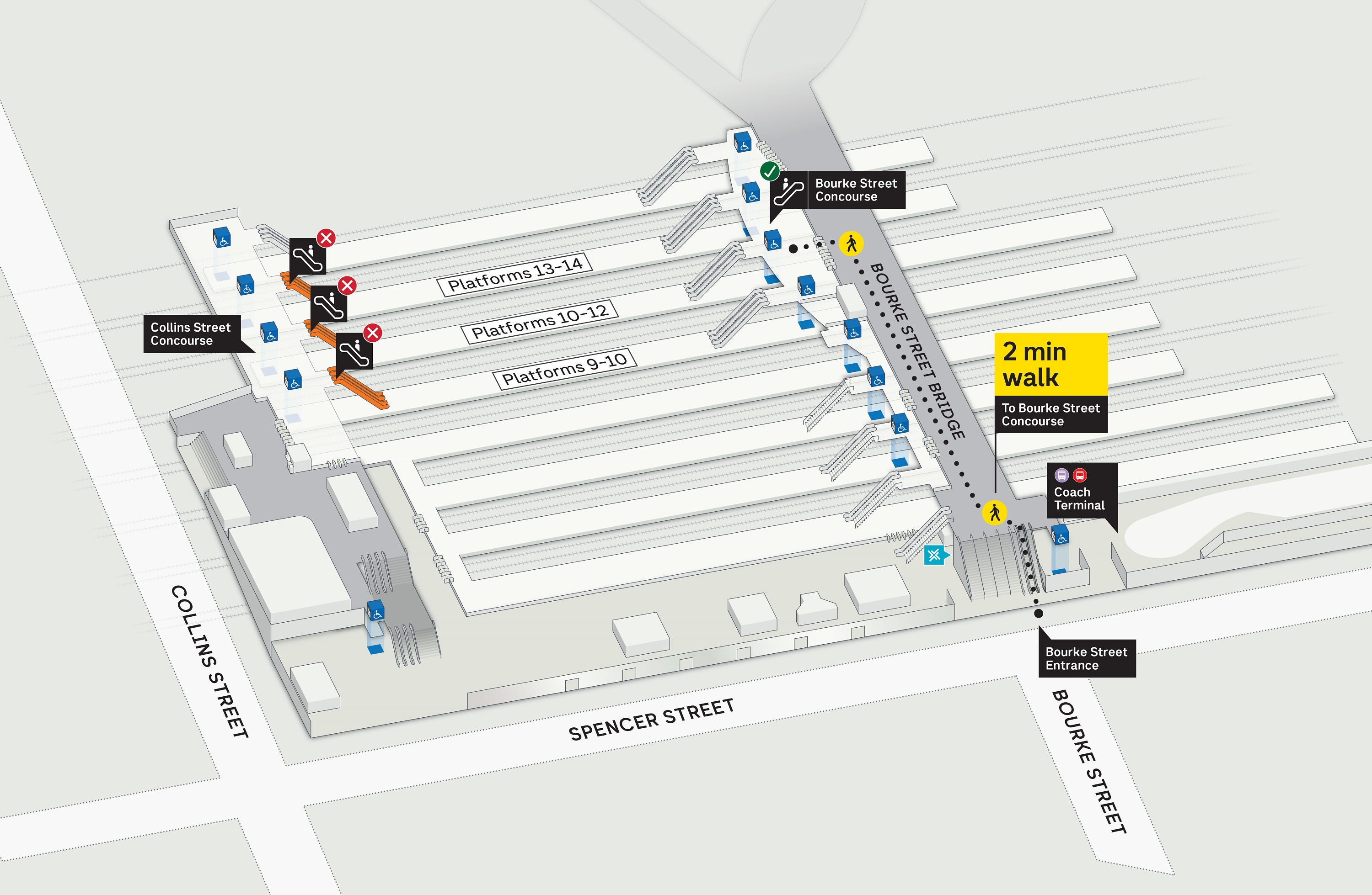 Weekday morning peak (7am – 10am): No escalators will be going down at the Collins Street end of the platforms. Please use the Bourke Street entrance, a four-minute walk along Spencer Street from the Collins Street entrance.